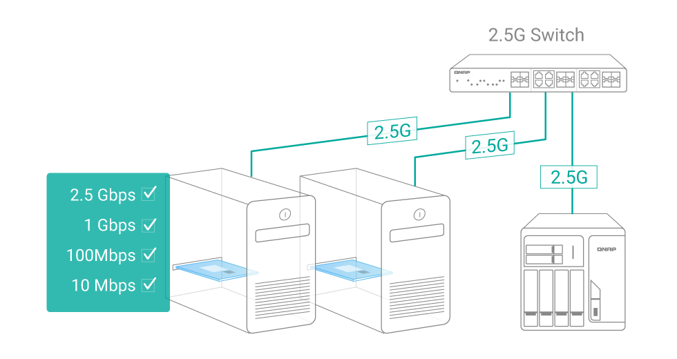 The QNAP QM2-2P2G2T QM2 PCIe card also features dual 2.5GBASE-T Multi-Gigabit (2.5G/1G/100M/10M) network ports to empower your NAS/computer/server with high-speed 2.5GbE connectivity for bandwidth-demanding tasks.