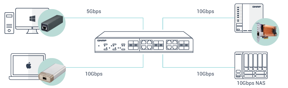 From NAS with built-in 10GbE SFP+ and 10GBASE-T ports, or NAS with PCIe slots that support 10GbE network adapters, QNAP has led the industry in 10GbE adoption. Other high-speed network solutions from QNAP include Thunderbolt 3 to 10GbE Network Adapters and USB 3.2 Gen 1 to 5GbE Network Adapters. These can all be used with the QSW-M1204-4C to create a comprehensive high-speed network environment for boosting the performance of photo/video editing, virtualization, large-file data transfers, and other bandwidth-demanding tasks.