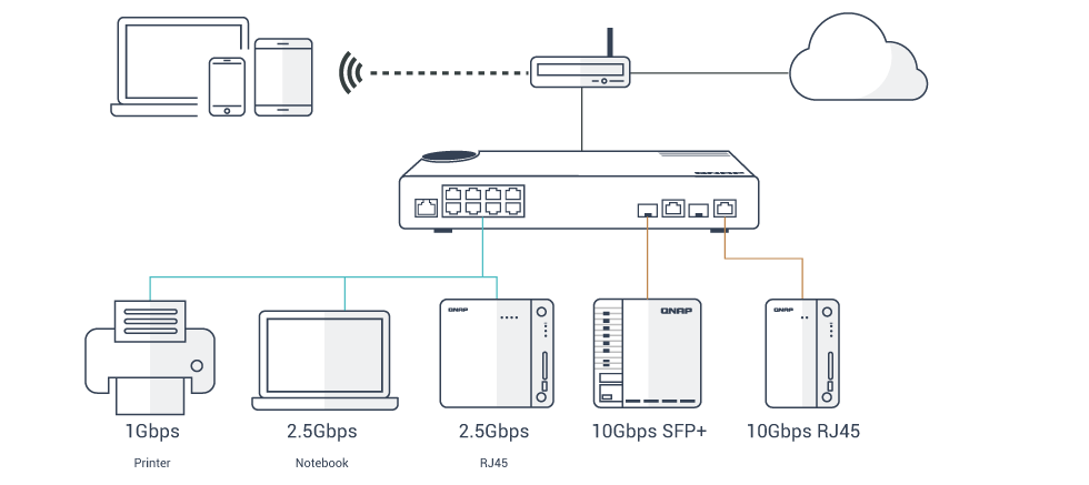 The QNAP QSW-M2108-2S provides two 10GbE SFP+/RJ45 combo ports and eight 2.5 Gigabit ports for connecting various devices and enabling hybrid high-speed networks. With SFP+ interfaces, Direct Attach Copper (DAC) cables can be used for connecting directly to SFP+ devices. You can also use RJ45 ports to connect 10GBASE-T/NBASE-T™ devices through RJ45 Category 6 (or better) cabling. The switching capacity of the QSW-M2108-2S is 80Gbps, guaranteeing the full potential of each port.
